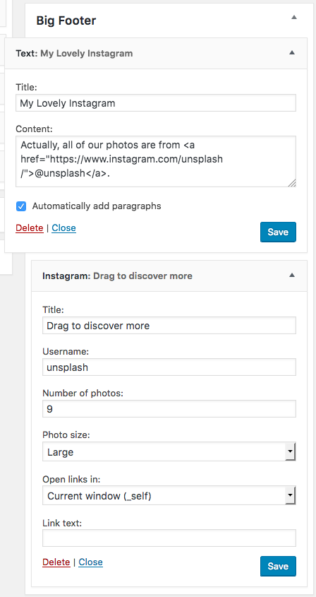 Three widget areas are used for footer widget columns, one representing each column. These are flexible footer widgets, meaning that the footer widget column layout will automatically adjust depending on how many widget areas are active. As mentioned above, if any footer widget is active alongside Jetpack Infinite Scroll, the latter will automatically switch to "click to scroll" functionality to make sure your website visitors can see whatever content is in your footer widgets without scrolling forever."Big Footer" and Instagram Support