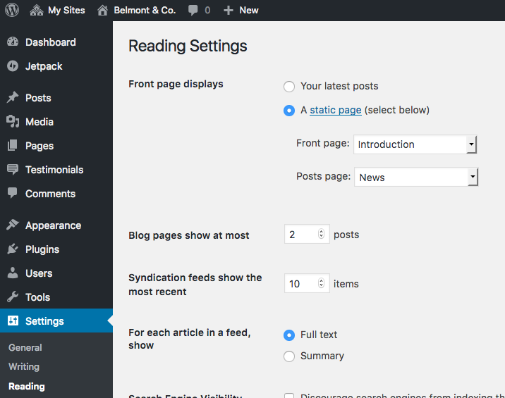 Belmont features a homepage template, comprised of pages that already exist on your WordPress site. This makes your content highly portable!Step 1: Adjust Reading Settings